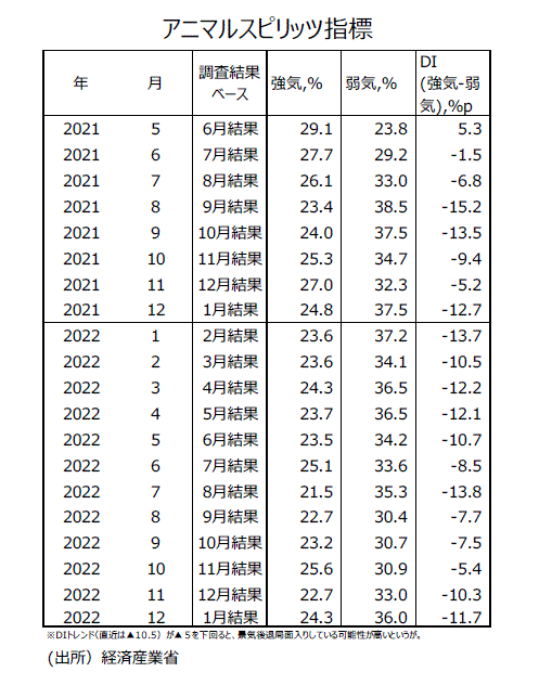 ●経済産業省は製造工業生産予測指数からアニマルスピリッツ指標を作成している。21年6月調査結果で、アニマルスピリッツ指標(生産活動マインド指標:DI)は10カ月連続のプラスの数値となり、企業の生産マインドは強気超の状況が続いていたが、21年7月~23年1月調査結果ではDIは19カ月連続のマイナスになっている。23年1月調査結果のDIは▲11.7である。22年12月調査結果のDI▲10.3から低下した。