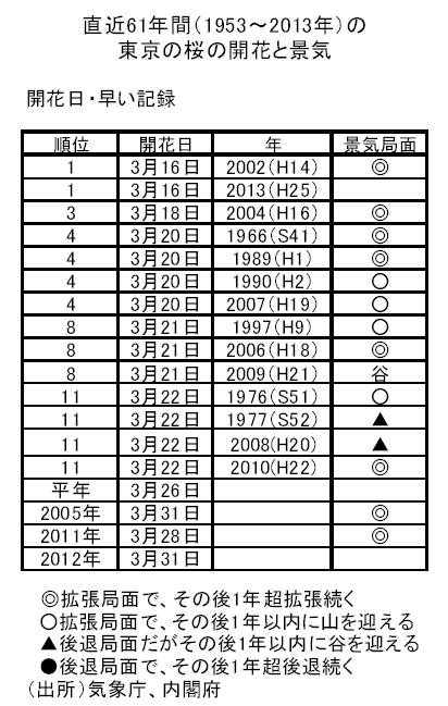 今年は桜の開花が早く3 月下旬に見頃を迎えた地域も多かった。東京の開花日は3 月16 日。平年より10 日も早く、1953年の生物観測調査開始以降では最も早い開花日に並んだ。東京の開花日が、平年の3 月26 日より5 日以上早い年では、3月は景気後退局面になったことはない。早く春が来ると春物の消費が盛り上がり、景気は拡張局面を迎えているようだ。今年と同じく16 日に開花した2002 年は、73 カ月景気拡大が続いた「いざなみ景気」が始まった年だった。春物衣料などの商戦が早まるほか、外出しやすくなることで個人消費の底上げが期待できる。また明るいムードが経済全体に広がることも景気を下支えするのだろう。お花見気分が後押しすれば、景気回復も力強さを増すことだろう。今春は花粉の飛散が多く、人々が外出を手控えることで消費の抑制要因になることが懸念されていたが、こうしたマイナス要因を花吹雪のように吹き飛ばすことになった可能性が大きいだろう。