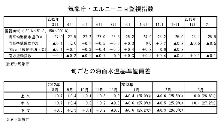 3 月11 日に発表された「エルニーニョ監視速報」によれば、「エルニーニョ現象もラニーニャ現象も発生していない平常な状態が続いている。春から夏にかけても平常の状態が続く可能性が高い」と気象庁は予測している。その後に発表された3 月上旬、中旬の監視海域の基準値偏差は概ねゼロである。今夏の猛暑が回避されれば、増加傾向にある生産の抑制要因になる可能性が低くなり、景気にプラスに働くだろう。