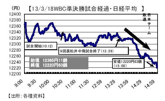 スポーツイベントでは、残念ながらWBC3 連覇を逃した侍ジャパンも、アメリカ行きを決めた2 ラウンドまでは、テレビ中継も30%台の高視聴率を記録し、日本中を元気付け、株価押し上げにも貢献したようだ。過去2 回のWBC では、優勝を決めたWBC の決勝戦当日の日経平均の終値は、開幕前日の終値に比べ、第1 回は832 円、第2 回は1054 円とどちらも上昇した。第3 回は開幕直前の3 月1 日の日経平均終値は1 万1606 円、3 月18 日(月)プエルトリコとの準決勝の日はキプロス問題で寄付きから200 円超下げていたが、試合が終了した日本時間午後1 時39 分以降約100 円下落し、この日は合計で前日比340 円の下落となったが、直前の3 月15 日(金)の終値は1 万2561 円で、ここまででは955 円も上昇していた。