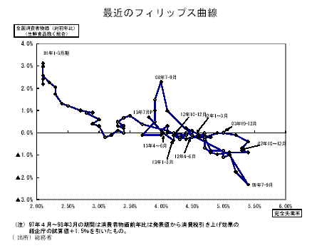 最近の雇用の数字も改善している。消費者物価コア指数の前年比と完全失業率との間には逆相関の関係があり、フィリップスカーブとしてグラフに表すことができる。08 年に原油物価が急騰・急落してカーブ自体が上下にシフトしたと考えられる時期を除くと、0%台半ばの消費者物価上昇率なら3%台の完全失業率が対応する関係にある。6 月分の消費者物価の前年比が+0.4%とプラスに転じ、6 月分の完全失業率は3.9%と08 年10 月分の3.8%以来の3%台に低下した。7 月分では、消費者物価+0.7%に対し完全失業率3.8%となり、フィリップスカーブに沿った動きがあった。