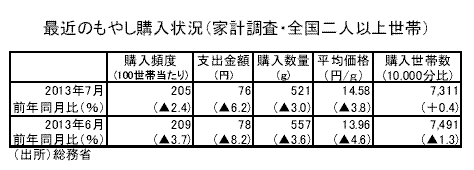 身近なデータをみると、景気の良さを示唆する身近なデータは引き続き多い。栄養価があり値段が安く節約食材の代表と言える、もやし購入額は、家計調査によると6・7 月分と連続して低水準になった。購入金額だけでなく、購入数量も前年比で低下している。