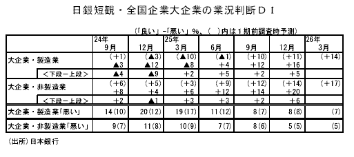 日銀短観・大企業・製造業・業況判断DI は9 月調査は+12 とリーマンショック後最高になり、続く12 月調査で+16へとさらに改善した。中小企業・製造業は07 年12 月以来の、非製造業は92 年2 月以来のプラスとなり、中小企業まで景気回復の裾野が広がってきていることを裏付けた。前回消費税引き上げ前の97 年3 月調査よりも業況判断DI はしっかりした内容になっている。