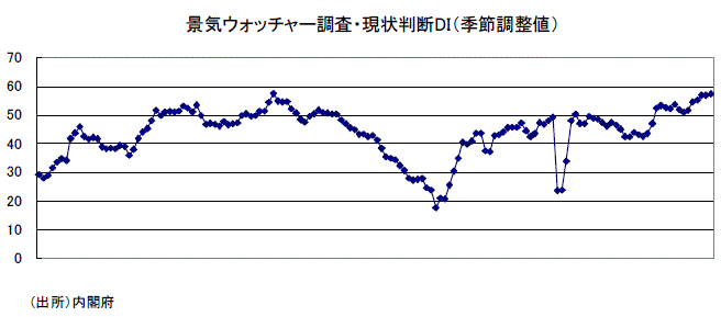 景気動向を敏感に示す「景気ウォッチャー調査」の現状判断DI は、直近14 年1 月で前月差1 ポイント低下の54.7 と高水準ながら低下したと報じられたが、これは季節的なクセで弱含んだだけである。季節調整値でみると14 年1 月は57.4で13 年12 月から0.5 ポイントの上昇、05 年12 月の57.5 に次ぐ統計史上第2 位の高水準だ。