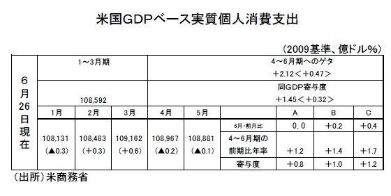 輸出は米国経済がしっかりしてくることを前提に見通しされているが、懸念材料もある。米国の1~3月期の実質GDPが前期比年率▲2.9%に下方修正され、4・5月分の実質個人消費の前月比がマイナスになったので、4~6月期の個人消費は今のままなら前期比年率+1%台と低調になる見通しになった。消費者信頼感指数など他のデータに比べて弱い状況だ。実質GDPは7月30日に4~6月期分発表と同時に過去3年分がリバイスされるので、その内容の見極めが必要だろう。