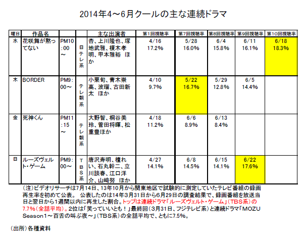 また、ビデオリサーチは7月14日、13年10月から関東地区で試験的に測定していたテレビ番組の録画再生率(録画番組を放送当日と翌日から1週間以内に再生した割合)を初めて公表した。公表したのは14年3月31日から6月29日の調査結果だ。トップは連続ドラマ「ルーズヴェルト・ゲーム」の7.7%(全話平均)。2位は「笑っていいとも!」最終回(3月31日)と連続ドラマ「MOZU」の全話平均で、ともに7.5%だった。後になって、「ルーズヴェルト・ゲーム」の評価が高まったかたちだ。