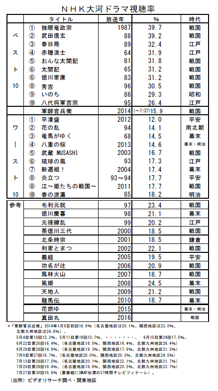 7月30日発売の「テレビガイド」に掲載されている7月20日第29回分の視聴率をみると、関東地区は19.4%だが、名古屋地区19.8%、関西地区20.5%、北部九州地区23.7%と西に向かうほど好調となっている。