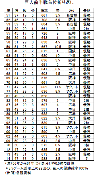 プロ野球セ・リーグのペナントレースも巨人が逆転してきた。巨人は交流戦直前では貯金わずか3で第3位に甘んじていた。しかし、そこから「逆転」した。巨人は交流戦で16勝8敗、優勝した。交流戦終了時には貯金11でセ・リーグ首位に立った。その後、7月16日に首位のまま前半戦を終了した。2位阪神とのゲーム差は3.5だ。巨人が前半戦2位のチームを3.5ゲーム差以上引き離して前半戦を折り返した過去22回は、全てセ・リーグ制覇である。優勝確率は100%と言える。7月末現在で2位の阪神を3ゲーム引き離して首位にいる。人気球団の優勝は景気にプラスに作用しよう。