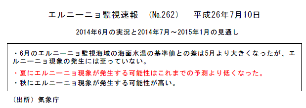 7月10日の気象庁「エルニーニョ監視速報」で、今夏に5年ぶりの発生が予想されていたエルニーニョ現象について、秋に発生する可能性が高いとの見通しに変わった。エルニーニョ現象は、東風が弱まって暖水の移動が滞り、ペルー沖の水面温度が高くなって発生する。6月上旬~中旬に発生した中部太平洋の水深100~200メートル付近の冷水が東に移動して、南米ペルー沖の暖水と混ざり、海水温の上昇が当初の予想より抑えられる見通しとなった。このため発生時期が後ズレすることになった。海面水温基準値偏差は6月下旬に+1.0℃だったが、7月中旬には+0.5℃まで急低下してきた。