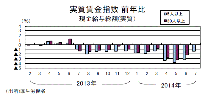 家計調査の弱さを指摘する向きも多い。7月分の二人以上世帯の実質消費支出は前年同月比で▲5.9%の減少だ。6月の▲3.0%より減少率が拡大した。消費税率引き上げの負担増が効いているという解釈がなされている。しかし、他の統計と比べると家計調査は弱すぎる感じがする。供給側の統計では7 月分の商業販売額・小売業は前年同月比+0.5%と4 ヵ月ぶりの増加となった。また7 月分の生産統計では、耐久消費財出荷指数の前年同月比は3 カ月連続減少だが、非耐久消費財出荷指数の前年同月比は2 カ月連続の増加である。家計調査は項目別の日次データがわかるなど、極めて有用なデータであるものの、サンプル数の少なさから振れやすい統計である。また同じ世帯が6 ヵ月間しか回答しないため、1 年後に前年同月比を比較する際には全く別の世帯と比較するという問題がある。最近の回答世帯では比較的低所得層が多いのではないかと考えられる内容である。家計調査は支出に注目が集まるが、勤労者世帯の収入のデータもある。足元では収入の悪化が目立つ。いわゆる税込み収入であり,世帯員全員の現金収入を合計したものである「実収入」は名目ベースの7 月分前年同月比は▲2.1%の減少だ。世帯主の収入は名目の前年同月比で見ると、定期収入が▲1.9%の減少、臨時収入・賞与も前年同月比▲2.9%とマイナスだった。今年はボーナスが前年より伸びたところが多いと報じられている状況とは全く異なる内容である。