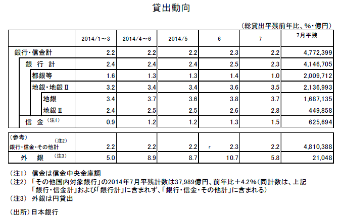13 年は異次元緩和でマネーストック(通貨供給量)が順調に伸びた。13 年のマネーストックの代表的な指標のひとつとされるM3 の年平均残高は+2.9%と現行統計で暦年の伸び率がある05 年以降で最大の伸びだ。ただ14 年に入り、少しブレーキがかかっている点が気懸かりだ。前年比でみたドル円レートの円安効果の弱まりや大口案件(電力など)の一服といった要因もあるのだろうが、銀行・信金計の貸出の前年同月比伸び率が今年に入って+2.2%前後で落ち着いていて伸びを高めていない数字をみると気になる。日銀の異次元緩和への認知度が金融資本市場などの関係者だけにとどまっていてはダメだろう。異次元金融緩和をきっかけとした物価上昇で、現在は実質金利がマイナスに転じている。つまり、お金を借りるのが有利な状況にある。こうした認識が幅広く浸透していくことが設備投資の裾野の拡大に必要だろう。