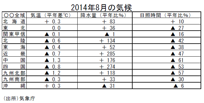 もっとも8 月は東北4 大まつりのようにカレンダー要因と雨による中止の影響などで人出が鈍ったものもある。8 月の降水量は四国で平年の3.7 倍となるなど、異常な状況である。天候要因が景気にどう影響を及ぼすか要注視という局面であろう。