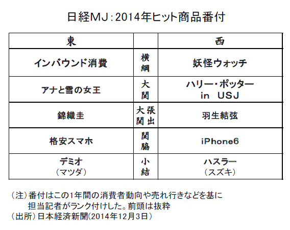 景気にとって明るい材料をひとつ挙げよう。日経MJ による2014 年ヒット商品番付で東西の横綱は「インバウンド消費」と「妖怪ウォッチ」だった。インバウンドとは、他地域から観光目的などで訪れる客や、その客を受け入れること。日本の場合は、外国からの訪日旅行者を示す。「インバウンド消費」と「妖怪ウォッチ」が消費を盛り上げる流れは、2015 年にも受け継がれよう。