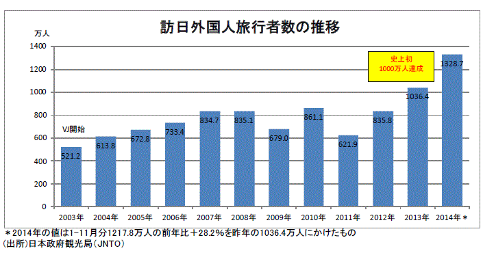 14 年が1300 万人を超えたことで、20 年の2000 万人目標達成に向け順調に推移している。最近の円安基調やアジア諸国向け観光ビザの発給要件緩和が主因だ。