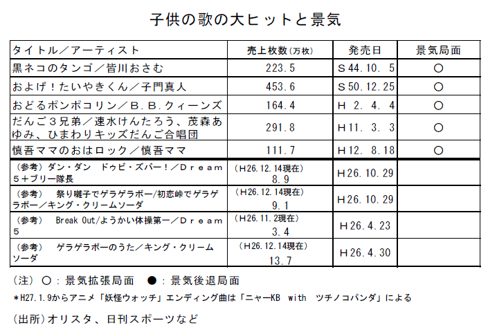 子どもの歌がヒットすると景気が良いことが多い。オリコンランキングが始まった60 年代後半以降、子どもの歌のミリオンセラーは「黒猫のタンゴ」をはじめ5 曲あるが、発売は全て景気拡張局面に当たる。親が子供にCD を買ってあげられる余裕があるからだろう。子どもを中心に大ブームとなっている「妖怪ウォッチ」関連の2 枚のCD が14 年10 月下旬に発売されたが、どちらも12 月14 日までで約9 万枚ずつと順調に売れている。人気グループ、嵐と人気アニメ「妖怪ウォッチ」が大みそかの第65 回NHK 紅白歌合戦で共演するという。企画枠で初出演し、同作の主題歌「ゲラゲラポーのうた」などを披露する男女3人組、キング・クリームソーダと5 人組ユニット、Dream5 のステージに嵐が登場。ジバニャン、フユニャンら同アニメのキャラクターと一緒に紅白を盛り上げるという。