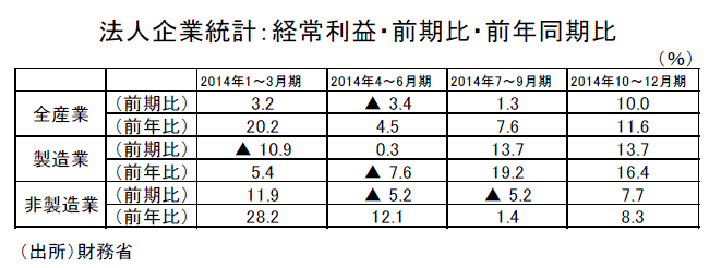 企業収益の動向はしっかりしている。法人企業統計によると10~12 月期の全産業・経常利益は前期比+10.0%増、前年同期比+11.6%増とどちらも2 ケタの伸び率になっている。企業収益の好調は、14 年度の3 兆円超の補正予算作成にあたって、公債費を減額しつつ税収の上振れ分を歳入に計上するほどだ。14 年度の実質GDP 成長率が、当初の政府経済見通しのプラス成長から約2%分下振れてマイナス成長が確実視される状況と相反する状況だ。