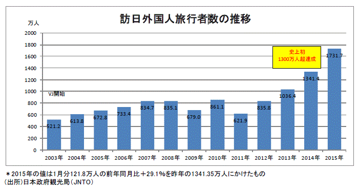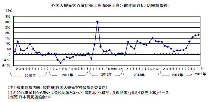 観光庁によると2014 年訪日外国人の旅行消費支出額は2 兆305 億円で過去最高となった。一人当たり15.1 万円支出している計算になる。昨年の訪日外国人の旅行消費支出額は名目GDP の0.42%に上る。昨年10 月1 日からは消費税の免税対象がほぼ全品目に広がった。日本百貨店協会の調査では外国人観光客の売上高・前年同月比は1 月分2.8 倍強という高い伸び率になっている。2 月分はさらに伸び率が上昇していそうだ。なお、地方の免税店が増加していけば、「地方創生」とも絡めるアイディアとともに、今後さらなる経済効果が期待できよう。