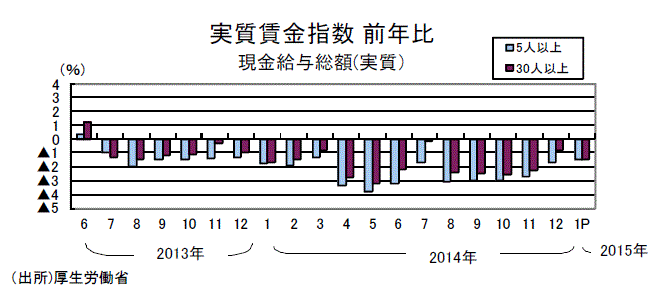全体として企業収益が好調な中、春闘ではそれなりの賃上げが期待される。消費税率引き上げの前年同月比への影響が4 月分になると剥落することを考えると、実質賃金の前年同月比は15 年度のどこかでプラスに転じる可能性が高いとみられる。賃金所得の増加が報じられるようになると、人々が安心し、個人消費の増加に結びついていくという、景気の好循環局面が始まりそうだ。