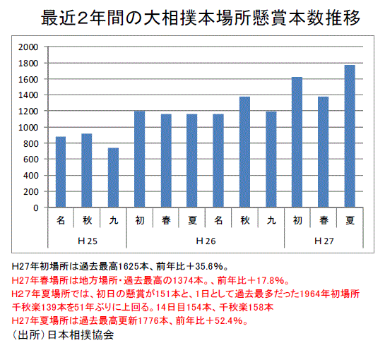 大相撲は、今年の初場所・春場所と2 場所連続で15 日間満員御礼を記録した。これは、「若貴ブーム」に沸いた90 年初場所から、その年の秋に金融危機が発生した97 年春場所までの、44 場所連続以来18 年ぶりということで話題になった。照ノ富士が初優勝し大関昇進を決めた5 月の夏場所も15 日間満員御礼で3 場所連続と記録を伸ばした。なお、夏場所では、初日の懸賞が151 本と、初日として最高だった今年初場所の130 本を上回り、1 日としての本数で過去最多だった1964 年初場所千秋楽の139 本さえも51 年ぶりに上回った。さらに14 日目154 本、千秋楽は158 本と次々と最多記録を更新した。横綱白鵬は2 度目の7 連覇と35 度目の優勝を逃したが、14 日目の稀勢の里との取組にかかった51本、千秋楽の日馬富士との取組にかかった 60 本の懸賞も逃した。夏場所は15 日間での懸賞は1776 本と最多記録を更新した。