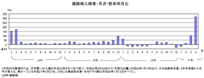 旅行への支出は底堅い。3 月14 日に北陸新幹線が開通した金沢では、5 月分の兼六園入園者数は前年同月比+71.4%の増加である。また、平成の大修理を終え、5 年ぶりに天守閣の中に3 月27 日から入れるようになった姫路城の、3 月分の入城者数は、前年同月比+105.1%、4 月分は+319.7%と大幅増加になっている。