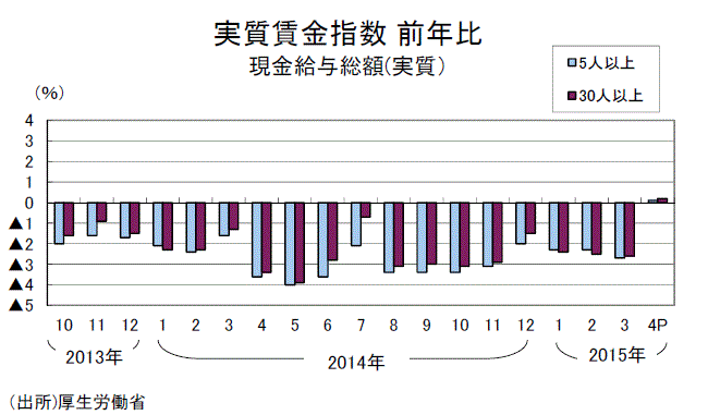 日銀短観の中小企業・非製造業・業況判断DI は、13 年12 月調査で+4 とバブル崩壊直後の92 年2 月調査以来、約22 年ぶりにプラスになった。旧ベースの14 年12 月調査では▲1 だが、調査対象企業定例見直し後の新ベースでは14 年12 月調査は+1 になった。15 年3 月調査では+3 とプラス基調を維持している。4 月分有効求人倍率は1.17 倍で23 年1 ヵ月ぶりの高水準になった。こうした雇用環境の改善を受け、経団連のまとめ(第1 次集計)によると、春闘賃上げ率は17 年ぶりの伸びになる見込みだ。また4 月分速報値の実質賃金は前年同月比+0.1%と2 年ぶりに上昇した。名目の物価を押し上げた14 年4 月の消費増税から1年が経ち統計上の影響が消え、企業業績の改善や人手不足による賃上げの影響が反映された。所得の伸びが消費増につながる。デフレ基調を脱して、緩やかながらも景気の好循環が今後も期待できよう。