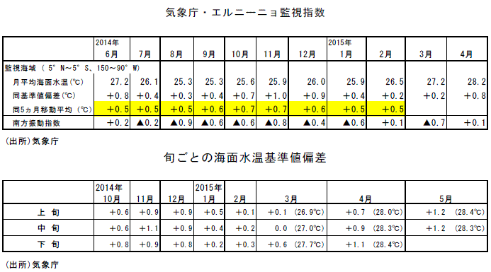なお、ギリシャ問題などの海外要因の他に景気の懸念材料のひとつとして挙げられるのは、エルニーニョ現象だ。5 月12日の監視速報で気象庁は「エルニーニョ現象が発生しているとみられる。今後、秋にかけてエルニーニョ現象が続く可能性が高い」とした。旬のデータでみると、3 月中旬の監視指数・基準値偏差は0.0℃だったが、3 月下旬に0.6℃と一気に目安の0.5℃を上回り、4 月上旬0.7℃、中旬0.9℃、下旬1.1℃、5 月上旬1.2℃、中旬1.2℃となっている。また今年は東京と大阪の桜の開花日の差が3 日で平年の2 日を上回った。今年が冷夏になり夏物消費にマイナスに働いても不思議ではない。