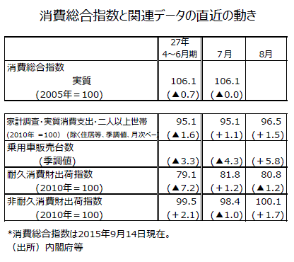日本経済は、企業収益の増加が雇用環境の改善・賃金の上昇に結びつき、全体的に底上げされてきている。しかし、マインド面を中心に中国発世界同時株安などの海外要因によって水を差されてしまった感じがする。8 月25 日から31 日が調査期間の「景気ウォッチャー調査」(8 月調査)は、中国の問題が発生した直後のデータだったので、注目された。
