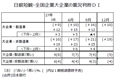 9月調査日銀短観は、大企業・製造業の業況判断DI が、中国経済など海外景気の減速を反映して、6 月調査の+15 を3 ポイント下回る+12 になった。但し、10 期連続で「良い」超を意味するプラスであり、9 期連続で2 ケタのプラスであることから底堅いとも言えよう。