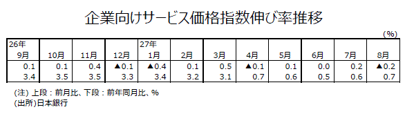 企業間で取引するサービスの価格水準を示す企業向けサービス価格指数の8 月分前年同月比は+0.7%の上昇となった。6 月分の+0.5%、7 月分の+0.6%から少しずつ伸び率が上昇し、13 年7 月分以来26 ヵ月連続の前年同月比プラスとなった。14 年度中は消費税引き上げ分もプラスに寄与しているが、その分を除いても企業向けサービス価格指数・前年同月比はプラスであった。26 ヵ月連続して前年同月比が上昇したのは86 年8 月から93 年9 月まで86 ヵ月間連続で上昇した時以来、22 年11 ヵ月ぶりのことである。