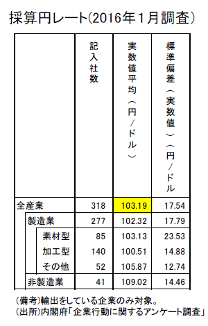 1月29日に日銀が「マイナス金利付き量的・質的金融緩和」を導入した。このサプライズ緩和で一旦は121円68銭まで円安が進んだ。しかし、日銀のマイナス金利効果が効いた期間は短く、2月9日には115円を割り込んだ。その後11日に一時110円台をつけた。その後3月初めまで111~114円台と110円台前半で推移している。2月の上旬頃はドル・円は10営業日で、昨年1年間の値動き幅を超えてしまう極めてボラタイルな展開だった。日銀短観12月調査での15年度下期の事業計画の前提の想定為替レートは1ドル=118円で、それより現状は円高で企業収益が厳しいということがよく言われている。しかし、今年1月時点の内閣府の調査によると、輸出企業の採算円レートは1ドル=103円19銭と現在よりかなり円高水準である。