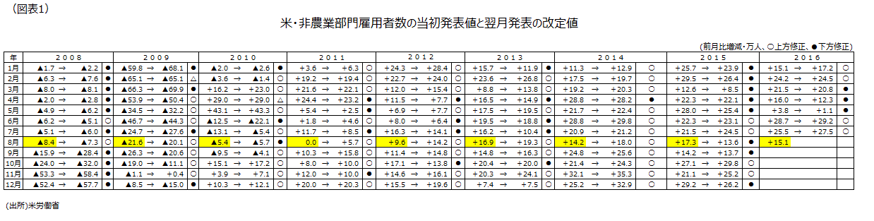 8月26日のニューヨーク市場でドル円レートは寄付きから終値にかけ1円50銭と大きく円安・ドル高に振れた。イエレンFRB議長が講演で「米国の雇用が改善し、追加利上げの条件は整ってきた」と発言、9月20~21日の次回FOMCも視野に入れて、追加利上げの時期を探る意向を示したからだ。8月分の雇用統計では、失業率は7月分と同じ4.9%だったが、非農業部門雇用者数の前月差は15.1万人増と市場の予測平均値の18万人増を下回った。市場の反応には温度差があったようだ。株式市場では9月の利上げが遠のいたとみてNYダウは72.66ドル上昇した。ドル円レートは雇用統計の発表直後に一時、1ドル=102円台後半まで上昇したが、その後はドル買いに転じた。8月分雇用統計は市場予想を下回ったものの、FRBの早期利上げ観測が根強かった。08年9月にリーマンショックが発生して以降、9月の前の月に当たる8月分の当初発表値は15年の17.3万人増が最高で18万人増に届いたことが一度もない。今回の15.1万人増もリーマンショック発生月前月の8月分の季節的パターンを考慮すれば出るべくして出た数字とも言える(図表1)。