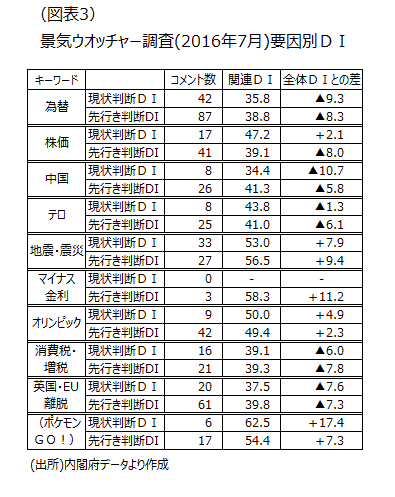 調査期間が6月25日~30日と、英国のEU離脱決定直後となった「景気ウォッチャー調査」で「英国」または「EU離脱」のキーワードを含むコメントから「英国・EU離脱」関連DIを作ると、現状判断DIが69人で30.8、先行き判断DIが357人で28.4と6月調査の景況感の下振れ要因だったことがわかる。357人は回答者の2割近くにあたる。また「為替」関連DIは現状判断DIが62人で31.4、先行き判断DIが255人で27.7とこちらも下振れ要因だった。英国のEU離脱決定に伴う円高が先行きさらに進むことへの不安が、足元の景況感の悪化につながった。なお、この不安感は7月調査でだいぶ薄まった(図表3)。現状判断の「英国・EU離脱」関連はコメント数20人でDIは37.5、先行き判断は61人で、DIは39.8となった。7月調査では為替DIも株価DIもコメント数は2ケタに減少しDIも改善した。