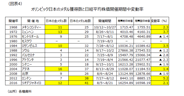 しかし、リオ・オリンピックのメダルラッシュは国民の気持ちを前向きにして株価上昇を後押した。メキシコ大会以降、日本が金メダルを10個以上獲得した大会では開催期間中の日経平均株価が上昇している。なお総数38個の過去最多のメダルを獲得したロンドン大会では、金が7個でも株価は上昇した。リオ大会では金12個、総数41個で株価も上昇した(図表4)。女子レスリング伊調馨選手がオリンピックの女子個人競技初の4連覇を果たし、国民栄誉賞受賞観測が浮上している。過去スポーツ選手が受賞した時は、概ね景気は拡張局面である。