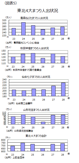 観光地では、北海道新幹線効果で、五稜郭タワー利用客数は4~8月分の前年同月比が各々プラス30%以上と堅調だ。函館で地震があった6月分でもプラス52.7%と高水準だった。8月はじめの東北四大まつりの人出合計は前年に比べ10万人増加した(図表5)。