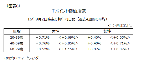 最近、スーパーなどでは物価上昇の勢いがなくなっている。スーパーのデータによる日経ナウキャスト日次物価T指数の8月分速報値は前年同月比+0.05%で7月分の+0.20%から鈍化した。しばらく、世の中の予想物価上昇率ももたつきそうだ。一方、コンビニなど底堅い分野が入っているTポイント物価指数前年同月比は7月分+0.33%、8月分+0.49%となっている。タバコの値上げが影響していよう。なお、高齢者のコンビニでの物価指数が高めであることは、車でスーパーに行けず近くで買い物をせざるをえない高齢者にとって、実質消費のマイナス要因になっていないか要注視であろう(図表6)。