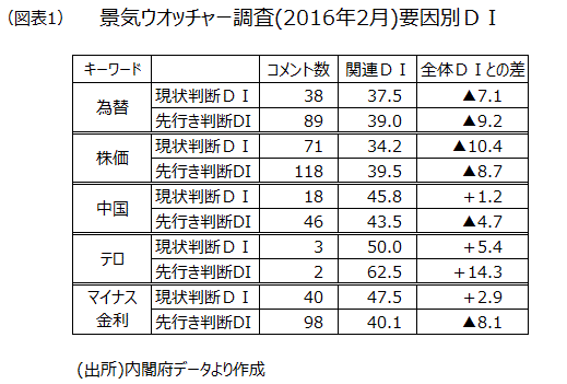 「景気ウォッチャー調査」2月調査で景気に影響を及ぼす要因のキーワード分析を行うと、「株価」や「為替」に関するコメントの影響が大きいことがわかる。先行きDIでは「株価」について118人、「為替」については89人の景気ウォッチャーがコメントした。各々の関連DIは39.5、39.0といずれも景気判断の分岐点50を10ポイント超下回り、マーケットの大幅な変動が景況感の悪化材料になったことがわかる。 例えば1月末から2月前半のドル円レートの変化幅は、日銀がマイナス金利導入を決めた1月29日の121円台から2月11日の110円台まで約11円もある。昨年2015年は変化幅が1年間で10円ちょうどだった。約半月で昨年の変動幅を上回るボラタイルな動きだった。一方、先行き判断に関する中国関連のコメント数は46にとどまり、関連DIは43.5であった。昨年の8月調査でコメント数が176、関連DIが37.4であったことに比べ、足元はそれほど悪影響を及ぼしていないことがわかる(図表1)。