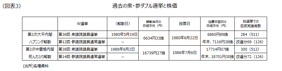3月18日の読売新聞の見出しには「衆参同日選も視野」とも書かれていた。衆参同日選は過去1980年代に2回あるが、いずれも与党の自民党が勝っている。株価も選挙期間中に上昇し、その後も選挙のあった年の年末まで上昇している。なお80年代は、日本経済が強いことは円高という市場の理解だったので、ドル円レートは円高方向に動いている(図表3)。