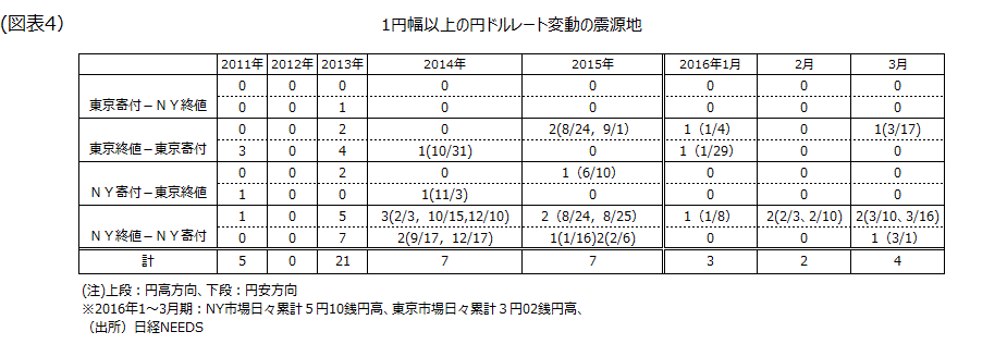 なお、16年1~3月期の為替変動の震源地分析してみると、ニューヨーク市場での日々の変化の方向の累積は5円10銭の円高で、東京市場の3円02銭の円高を上回る。また、円高方向への1円超の変動日は5回で、円安方向の変動日の1回や、日本の円高方向の変動日の2回を大きく上回る。1~3月期の円高はニューヨーク市場発によるものだったと言えそうだ(図表4)。