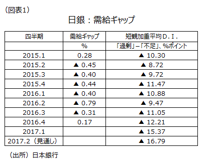 2局面分割の他に景気判断は4局面分割の考え方もある。4局面分割は、正常な水準から出発して、好況(拡大)、後退、不況(収縮)、回復の各局面を経て、再びスタートに戻ると考えるものだ。日本銀行が4月27日発表の「展望レポート」の景気の総括判断を「緩やかな拡大に転じつつある」に上方修正した。「拡大」はリーマン・ショック前となる08年3月以来9年ぶりで、好調な海外経済を背景にした輸出や生産が堅調な中で、判断を一歩前進させたとみられる。景気判断をこれまでの「回復」から「拡大」に強めたのは、景気は上向いている中、日銀の需給ギャップは17年1~3月期で+0.17%と15年1~3月期以来のプラスに転じた(図表1)ことを正常な水準に戻ったとみて、4局面分割的視点から、判断を強めたものと考えられる。