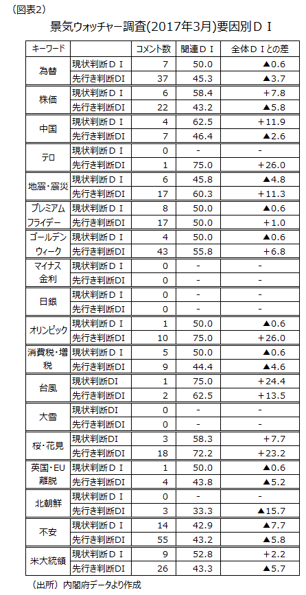 景気ウォッチャーの使用している言葉を分析し、景況感の足を引っ張っているものを探るキーワード分析を行ってみると、1月の段階では就任したばかりで大統領令を多発したことなどもあり「米国大統領」が挙げられたが、2月・3月ではそれといったものはない(図表2)。「不安」という言葉が漠然と使われるケースが多い。先行き不安といっても国際情勢や、少子高齢化が進む中での年金等の問題、天候不順への懸念など様々なものがあるだろうが、何に対して不安なのかはっきりしない。具体的に「北朝鮮」や「テロ」などの言葉を挙げた人はほとんどいない状況だ。4月後半の日経経済新聞では「円安」記事数が「円高」記事数を3月前半以来上回り、円高から円安方向の転換を示唆している。