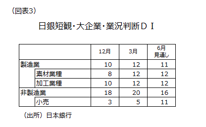 また、3月調査の日銀短観、大企業・製造業・業況判断DIは+12で、先行きが+11に低下している(図表3)。このため新聞報道では「海外の政治情勢などが見極めづらく、先行きには慎重な見方も根強い」とやや悲観的な見方が書かれていた。しかし内訳をみると変わった景色がみえる。製造業は素材業種と加工業種の他の項目はなく2つに分かれる。素材業種と加工業種の現状の業況判断DIはともに+12である。製造業全体の業況判断DI+12と一致する。先行きの判断DIは素材業種と加工業種ともに+12で現状と、どちらも変わらない。しかし、両者を合わせた製造業は+11に低下する。「慎重な見方も根強い」と書くほど実態は弱くはないかもしれない。