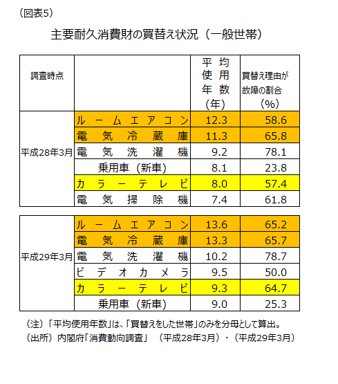 1作業日当たりの粗大ゴミ(東京23区清掃一部事務組合)の前年同月比の推移(図表4)をみると、戦後1番目の長さの「いざなみ景気」の景気局面の終盤の06~07年にプラスの山がある。その後08年のリーマン・ショックの後に09~11年にかけて大きなプラスの山がある。そして消費税引き上げにより、14年~15年にかけてマイナスの谷がある。しかし駆け込み需要が出てもおかしくなかった13年には大きな動きはない。粗大ゴミの動きは耐久消費財の動きを裏面から見るようなものだ。09年~11年にかけ家電エコポイント制度が実施され、家電合計で約4,500万件、中でもカラーテレビは約3,200万件の申請があった。カラーテレビの平均使用年数は8~9年程度のようだ(図表5)。今年3月の調査では約2/3が故障による買い替えだ。09~11年に需要の山があったと考えると、今年や来年あたりからカラーテレビの買い替え需要が出てきて景気の下支え要因になりそうだ。