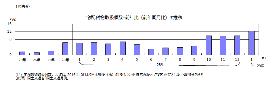 ヤマト運輸が宅配便の基本運賃を27年ぶりに値上げすることになった。人手不足でもサービスの質を落とさない一方で、賃上げも値上げもできずにいた日本の運送業が転機を迎えていることの表れだ。今年1月分の宅配貨物取扱個数は前年同月比+12.3%と2ケタになった(図表6)。需要があるのに人手が足りず、サービスの値段を上げざるを得なくなっている。ヤマト運輸の話は人々の物価見通しにプラスに働こう。一方、「デフレ脱却はイリュージョンだ」と言うスーパーの経営者がいる。コンビニでは日用品などの値下げの動きもあり、どっちの動きが勝つかの分岐点だ。