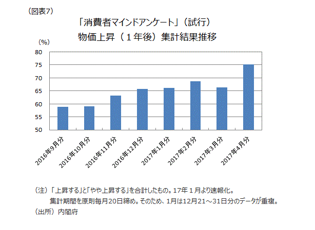 日銀の展望レポートでは、「中長期的な予想物価上昇率は、弱含みの局面が続いている。各種のマーケット関連指標やアンケート調査結果をみると、上昇しているものもみられるが、総じてみるとなお明確な持ち直しには至っていない。」と慎重な見方だった。しかし、注目度が低いが極めて速報性がある、内閣府「消費者マインドアンケート調査」4月分(4月20日までのデータを集計し4月24日に発表)で、1年後の物価が上がるとみている人の割合(上昇+やや上昇)は75.3%と、16年9月の調査開始以来最大の数字になった(図表7)。4月からのたばこ、オリーブオイルなどの値上げ、5月からのバターやティッシュペーパーなどの値上げの動きも反映されていよう。