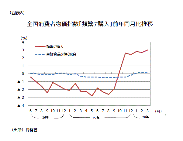 丹念に見ると、物価上昇期待の高まりを裏付ける数字が、直近3月分の全国消費者物価指数「品目の年間購入頻度階級月指数」に出てきた。全国消費者物価指数の「品目の年間購入頻度階級月指数」の「頻繁に購入」の3月分前年同月比は+3.0%と14年10月分の+4.1%以来29ヵ月ぶりの高水準になった(図表8)。