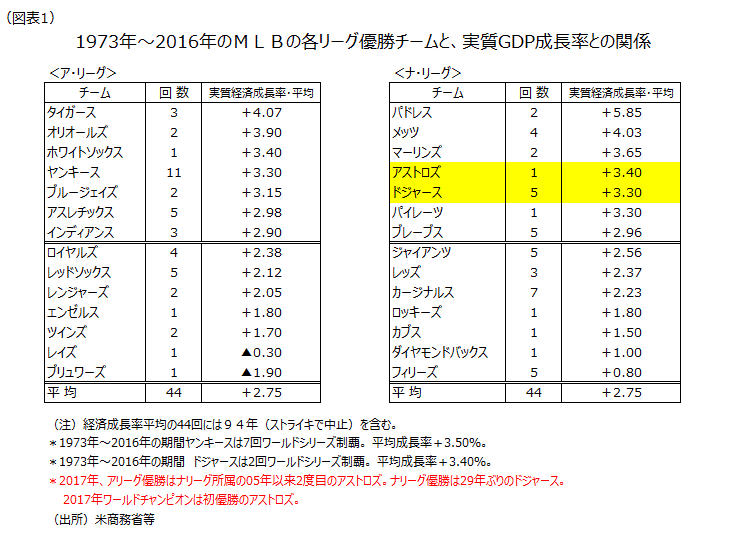 MLBのワールドシリーズに進出する球団と米国の実質GDP成長率との間に関連性がある(図表1)。第1次石油危機が発生した73年以降昨年16年までの44年間の実質GDP成長率の平均は+2.75%である。ヤンキースのような人気球団がア・リーグで優勝しワールドシリーズに出場する時の実質GDP成長率は高めになる。73年以降ではヤンキースは11回ア・リーグで優勝しているが、優勝年の実質GDP成長率の平均は+3.30%で44年間の平均を上回る。7回のワールドシリーズ制覇年の平均は+3.50%である。今年、ヤンキースは田中将大投手の活躍もあり5年ぶりにリーグ優勝決定戦に進出した。しかし、アストロズに敗れた。今年のア・リーグ優勝はナ・リーグ所属の05年以来2度目のアストロズで、4勝3敗で初のワールドチャンピオンに輝いた。なお、かつて1回だけワールドシリーズに出場した年の実質GDP成長率は+3.40%で平均を上回っていた。ナ・リーグ優勝は29年ぶりのドジャースだった。73年以降は5回ワールドシリーズに進出している。ワールドシリーズ出場年の実質GDP成長率の平均は+3.30%だ。ワールドチャンピオンになった2回の平均は+3.40%である。今年のワールドシリーズ進出チームからみると、足もとの米国景気は良さそうだ。