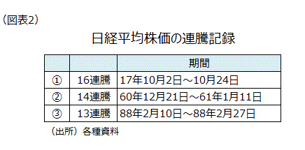 10月2日から24日にかけて日経平均株価が16連騰し連続上昇の最長記録を更新した。これまでの最長は池田内閣が所得倍増計画を打ち出した時期に記録した60年12月21日~61年1月11日の14連騰だった(図表2)。日経平均株価はドル円レートが1ドル=110円台に入った9月後半以降上昇基調で、2万円台で推移している。10月22日の衆議院議員総選挙で与党が圧勝し、アベノミクスの継続期待が高まったことなどを背景に、11月2日の高値は2万2,540円をつけ、バブル崩壊後96年につけた2万2,666円の高値まであと一歩のところまできた。なお、日経平均株価の連騰記録は「16」で止まったが、16年7月以降続いている月初の上昇連続記録は11月で「17」になった。