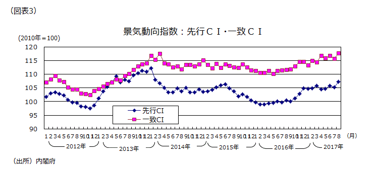 (景気動向指数8月分改定値、一致CIは、リーマンショック前の07年10月以来10年ぶりの水準に)