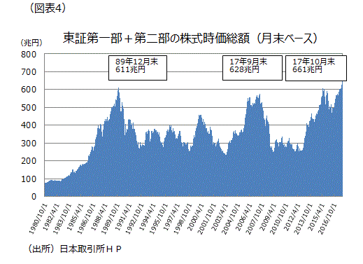東証の第一部と第二部を合計した株式時価総額(月末値)は、バブル期ピークの89年12月末が611兆円で過去最高であったが、17年9月末で628兆円と26年9カ月ぶりに更新した。さらに10月末で661兆円まで増えた(図表4)。日本企業が国内だけに依存するのではなく海外で稼ぐ、あるいはインバウンド関連で稼ぐことで、売上数量を伸ばす力をつけてきたことなども背景にあろう。日本政府観光局によると訪日外国人客数は今年1~9月期で、2,119万人となり、過去最速ペースで2,000万人超えを達成した。今年の訪日外客数は2,800万人程度になりそうで、「ヴィジット・ジャパン」のキャンペーンが始まった03年の521万と比べ5倍強になる。1~9月期の訪日客消費額は3.3兆円となった。同じ期間で3兆円超えは初めてで、年間で4兆円を突破する可能性が高い。