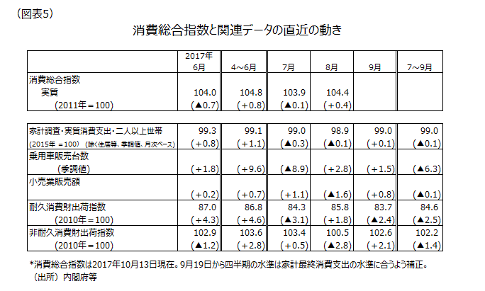 足もと気になるのは非製造業である。日銀短観9月調査では大企業・非製造業の業況判断DIは+23と高水準ながら、6月調査に比べ横ばいにとどまった。前期比年率+2.5%の4~6月期・実質GDPでは、個人消費が前期比プラスだった。しかし7~9月期では関連指標から見て、実質個人消費が前期比マイナスになる可能性が大きい(図表5)。8月の関東の長雨や9月~10月の休日に重なった台風などの天候要因、昨年の円高の影響が今夏のボーナスのマイナス要因になったことなどが影響していそうだ。「景気ウォッチャー調査」では「不安」というコメントが相変わらず多く、漠然とした「不安」も財布のヒモを締める要因になっていそうだ。